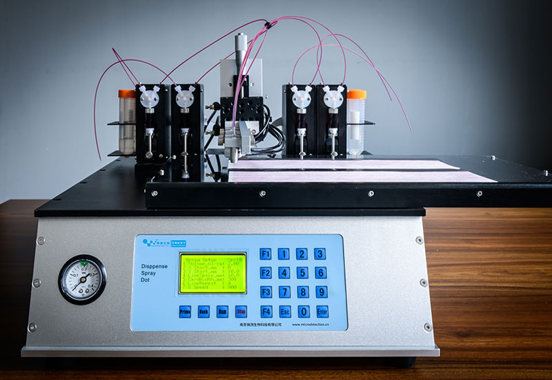 大平臺多通道噴金標機應用于生產(chǎn)過程中均勻地把膠體金,熒光微球,量子點等顆粒均勻地噴在聚酯膜,玻纖等材料上。相比于傳統(tǒng)的噴金機,效率大大提高,是特大型企業(yè)必備的生產(chǎn)設(shè)備之一。